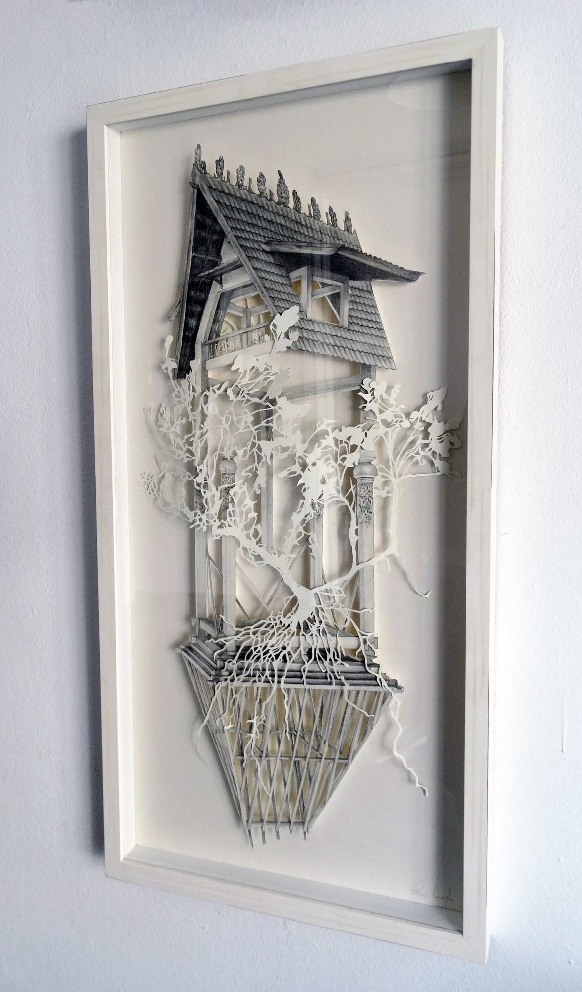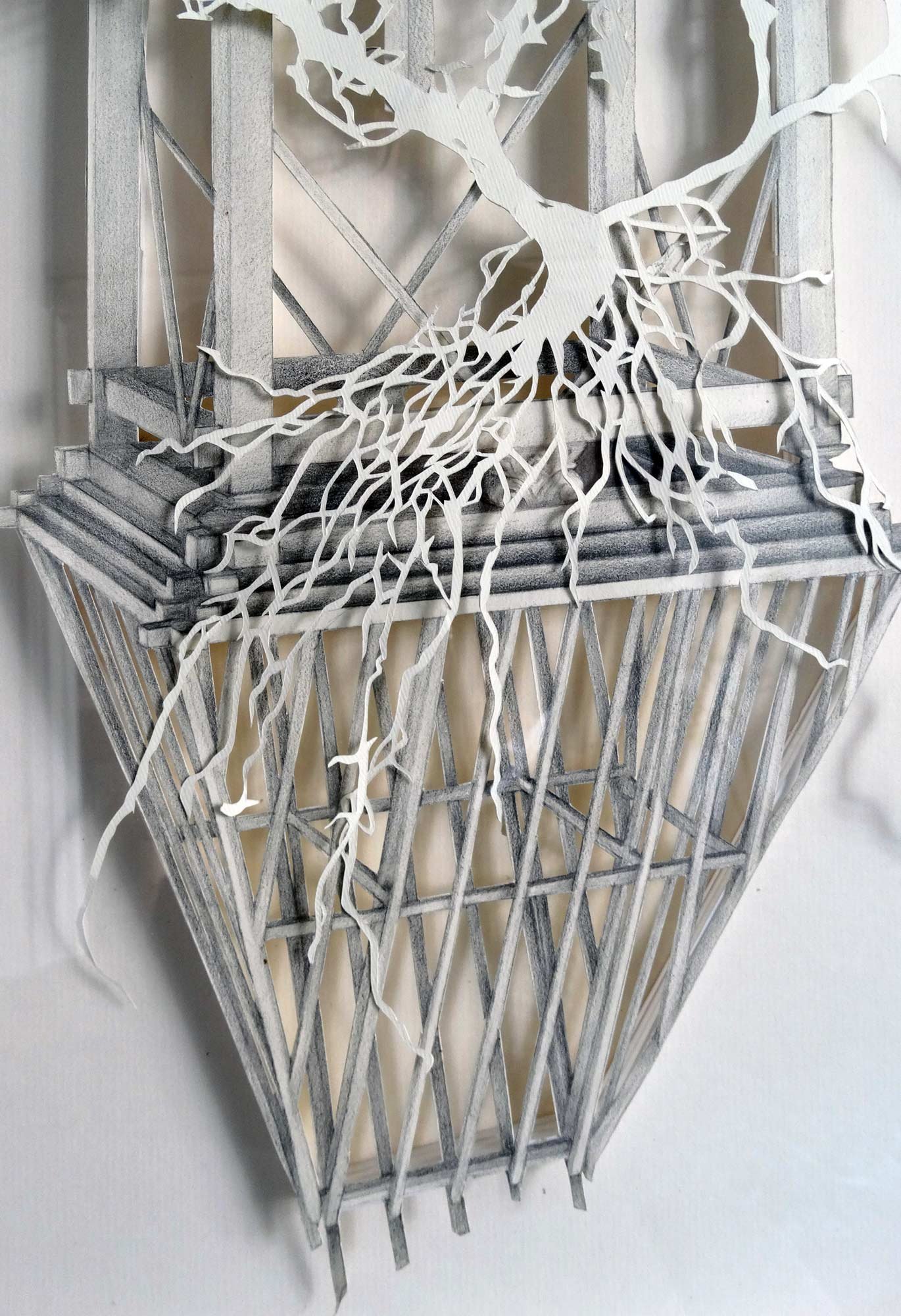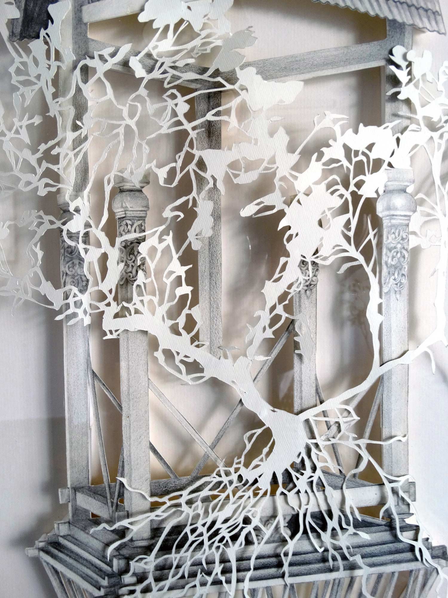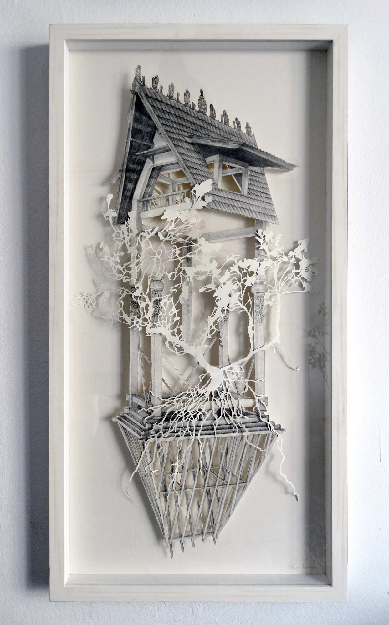 This pencil drawing collage draws from memories of Indonesian landscapes and architecture, using drawing and papercut techniques to reconstruct a moment when, despite everything crumbling, nature quietly persisted — thriving in the cracks, blooming from the dust.